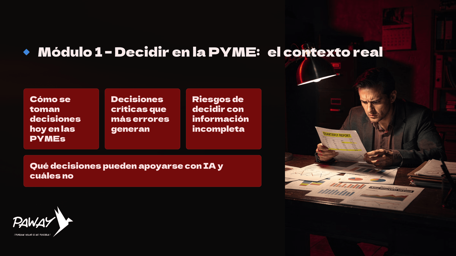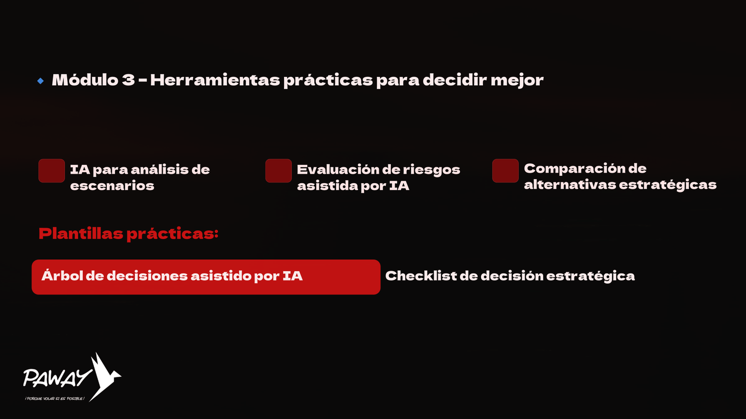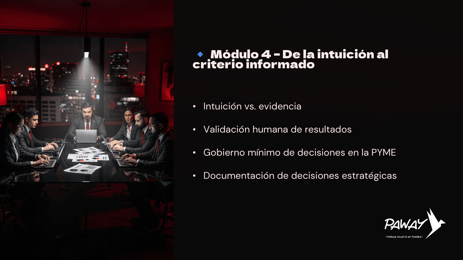 Un taller práctico para directivos que necesitan tomar mejores decisiones estratégicas, reducir riesgos y ganar claridad en contextos de alta incertidumbre, apoyados en Inteligencia Artificial.